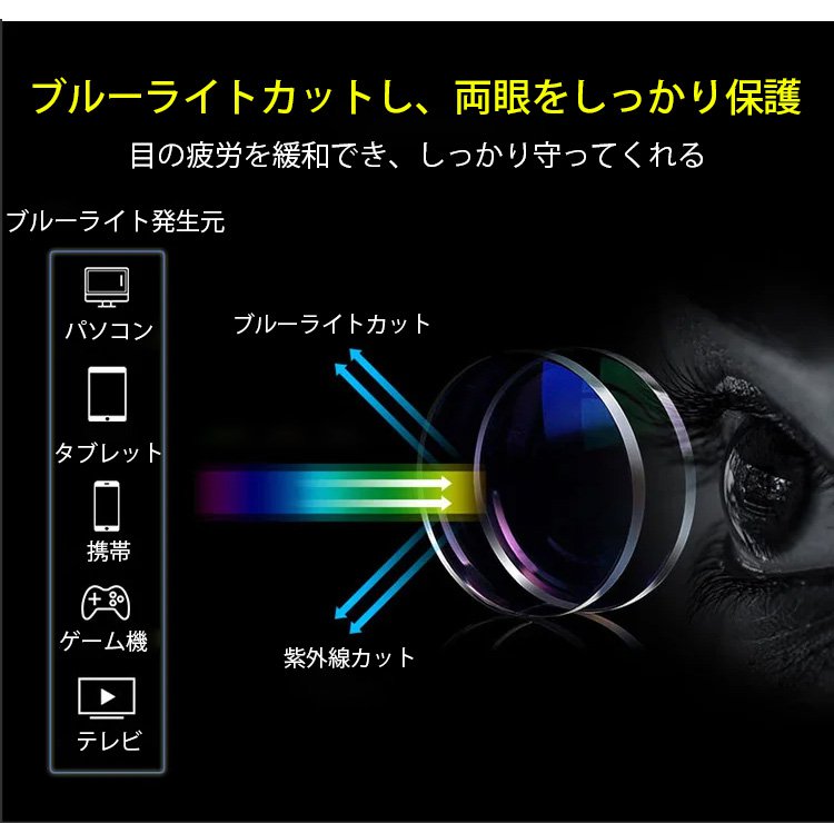 ブルーライトカット、紫外線カット、クリアな視野、軽量
