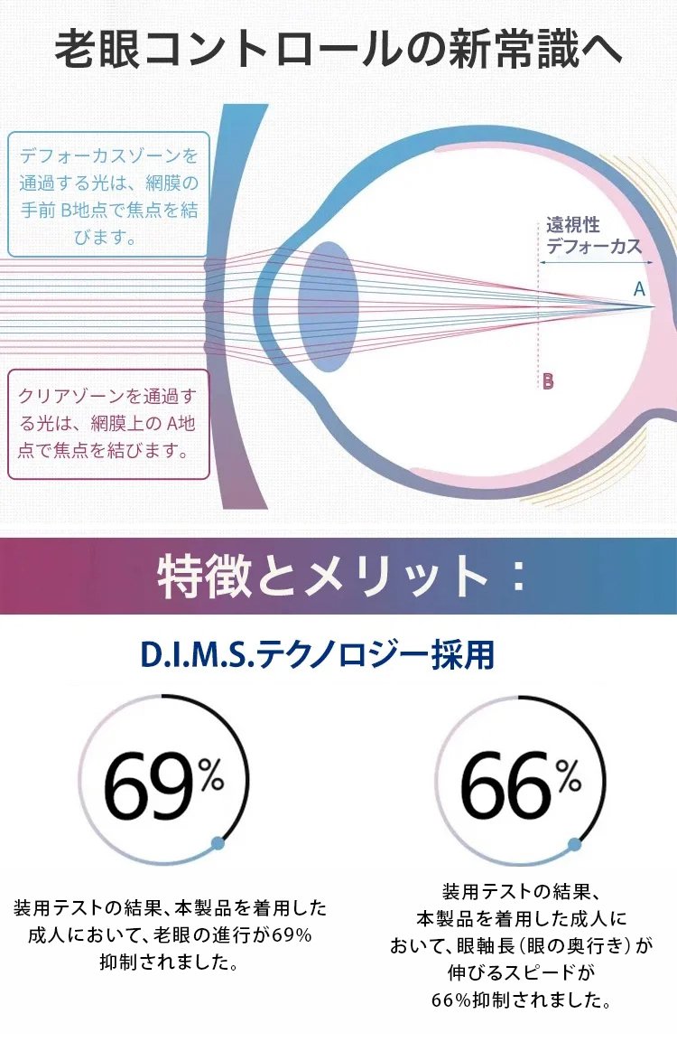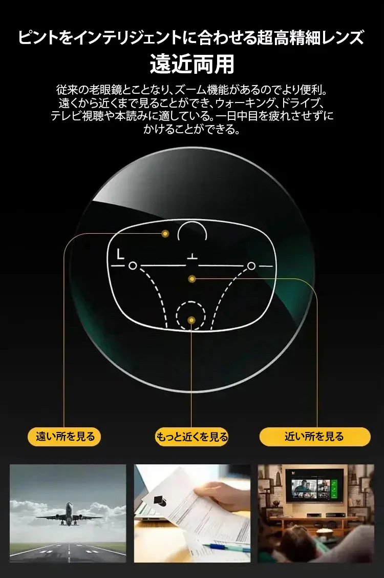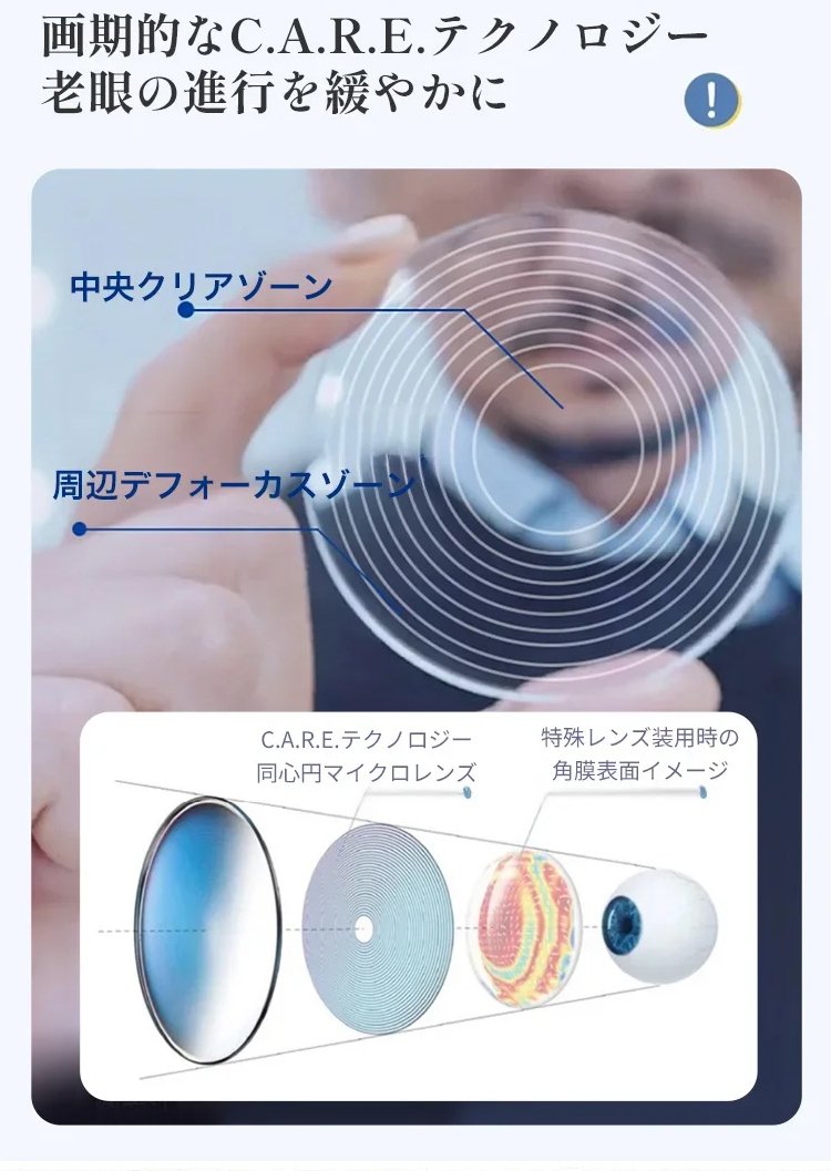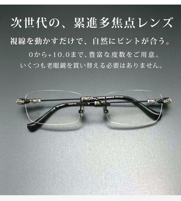 日本の眼科医療技術と共同開発し、ドイツで特許を取得した最新の「累進多焦点レンズ」を採用。